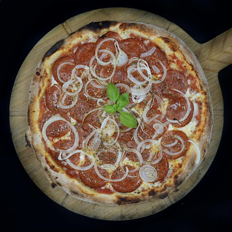 Sos pomidorowy, ser mozzarella, salami peperoni, cebula, pieczarki, oregano / Tomatensauce, Mozzarella, Salami, Zwiebel, Champignon, Oregano