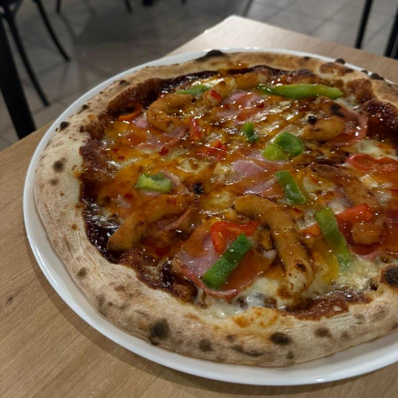 Sos BBQ / mozzarella / boczek / krązki cebulowe / papryka / camembert / sos sweet chilli