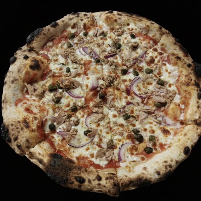 Sos pomidorowy, ser mozzarella, tuńczyk, czerwona cebula, kapary, oregano / Tomatensauce, Mozzarella, Thunfisch, Rote Zwiebel, Kaparen, Oregano