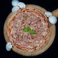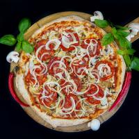 Sos pomidorowy, ser mozzarella, salami peperoni, cebula, pieczarki, oregano / Tomatensauce, Mozzarella, Salami, Zwiebel, Champignon, Oregano