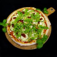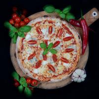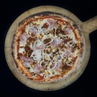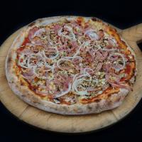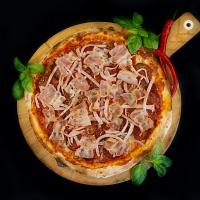 Sos pomidorowy, ser mozzarella, pieczarki, szynka, boczek,cebula,  pieprz, płatki chilli