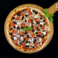 Sos pomidorowy, ser mozzarella, czarne oliwki, czerwona cebula, ser feta, pomidorki koktajlowe, oregano / Tomatensauce, Mozzarella, schwarze Oliven, rote Zwiebeln, Feta Kase, Kirschtomaten, Oregano