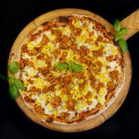 Sos pomidorowy, ser mozzarella, kurczak, ananas, kukurydza, oregano / Tomatensauce, Mozzarella, Huhn, Ananas, Mais, Oregano