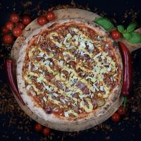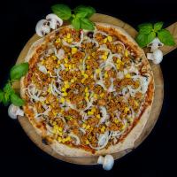 Sos pomidorowy, ser mozzarella, kurczak, cebula, pieczarki, kukurydza, oregano / Tomatensauce, Mozzarella, Huhn, Zwiebel, Champignon, Mais, Oregano