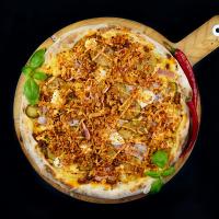 Sos śmietankowy, mozzarella, boczek, podgrzybki, gorgonzola, cebulka smażona, pietruszka