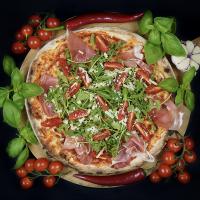 Sos pomidorowy, ser mozzarella, szynka parmeńska, rukola, pomidorki koktajlowe, parmezan / Tomatensauce, Mozzarella, Parmaschinken, Rucola, Kirschtomaten, Parmesan