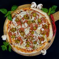 Sos pomidorowy, ser mozzarella, salami peperoni, cebula, pieczarki, jalapeno, oregano / Tomatensauce, Mozzarella, Salami, Zwiebel, Pilze, Jalapeno, Oregano